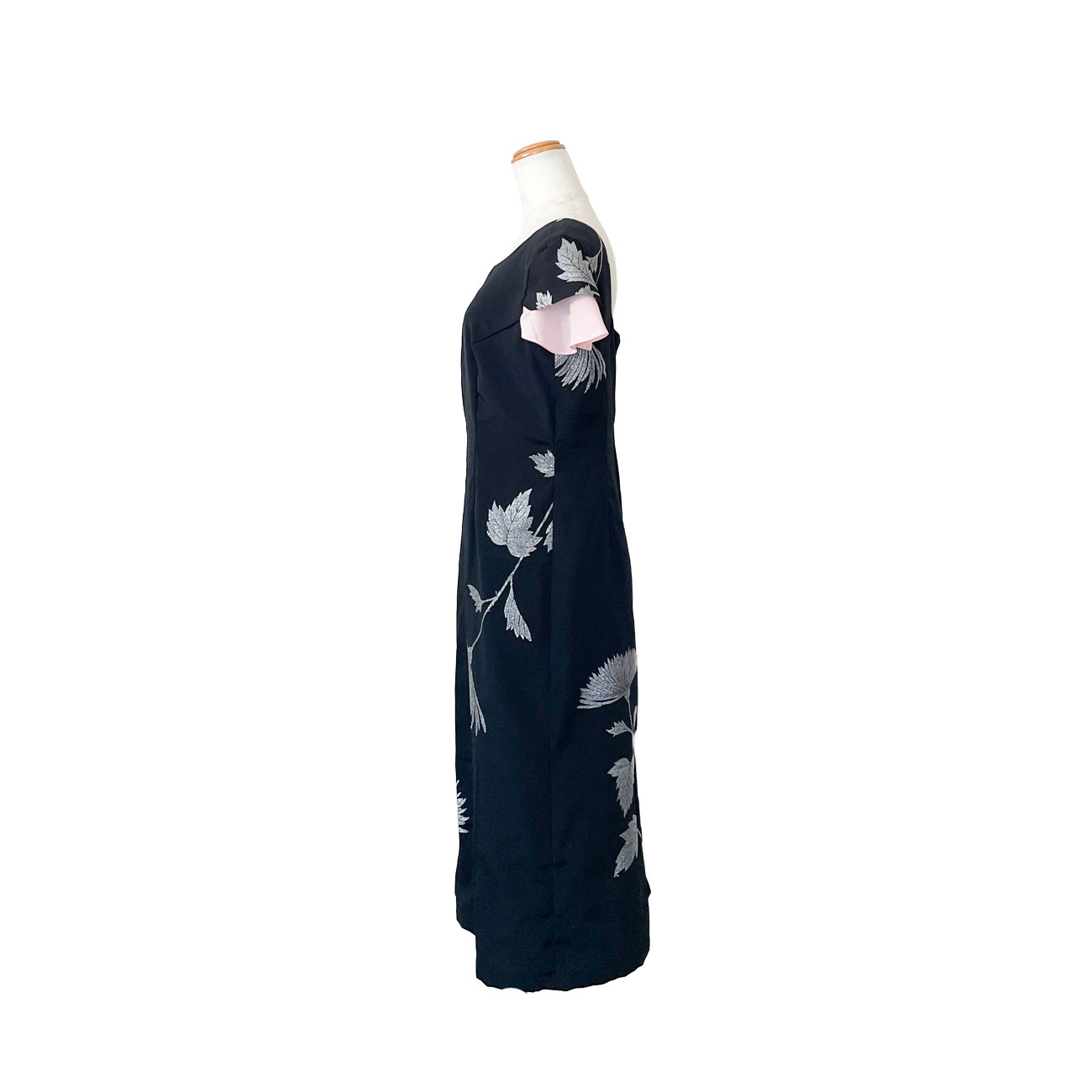 一見シンプルな中に、背中が大きく開いたセクシーさ、肩山を隠す小さなフリルのお袖でフェミニンさも忘れずに。