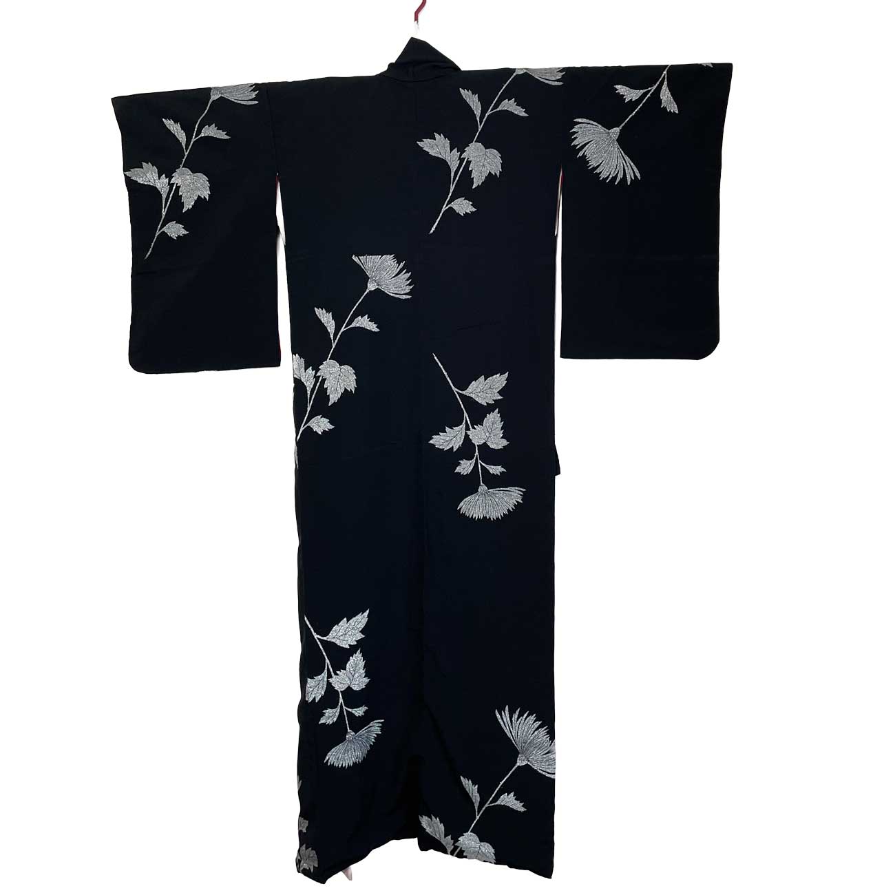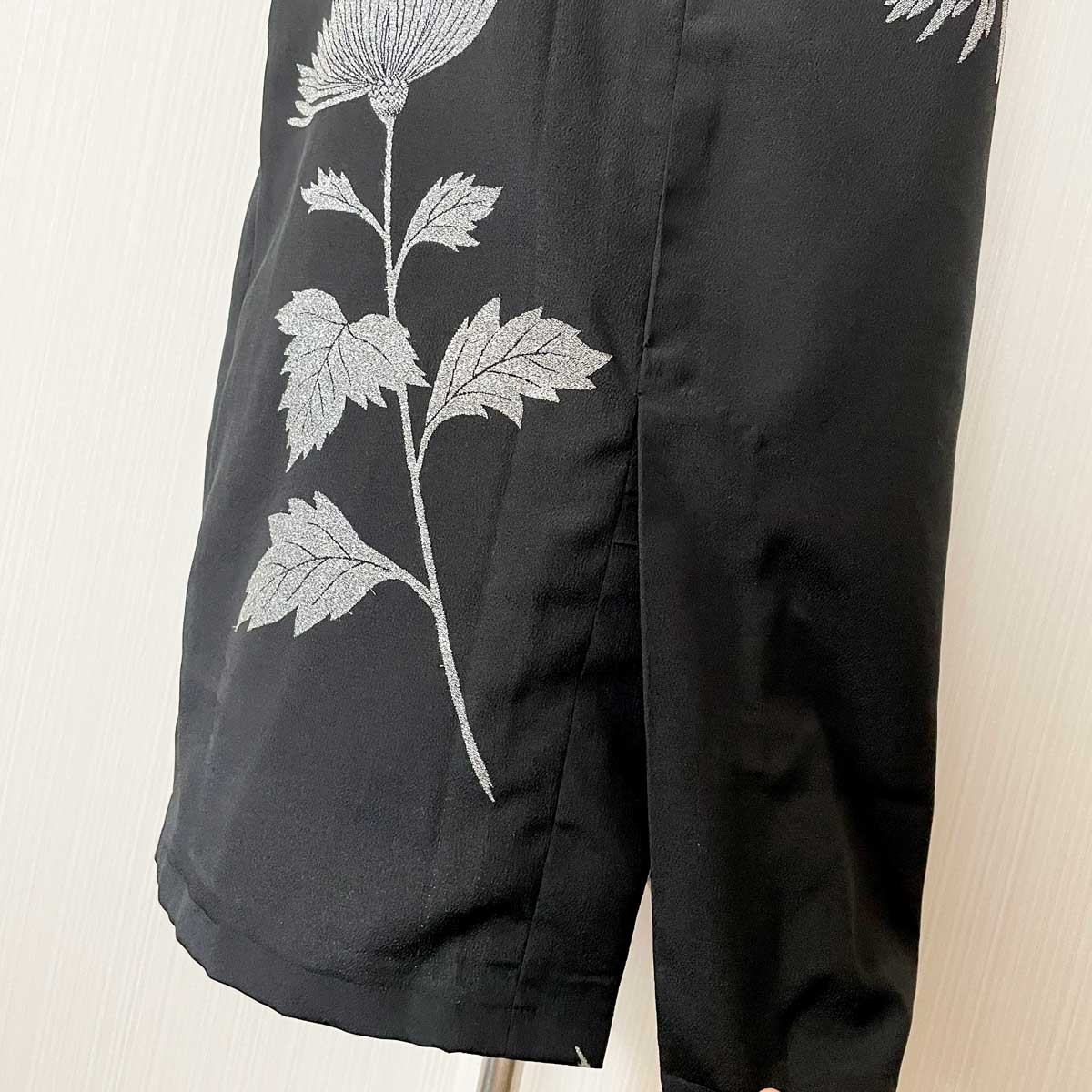 黒い背景に、大胆に配置された銀色の花模様。あざみか菊のように見受けられます。
