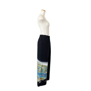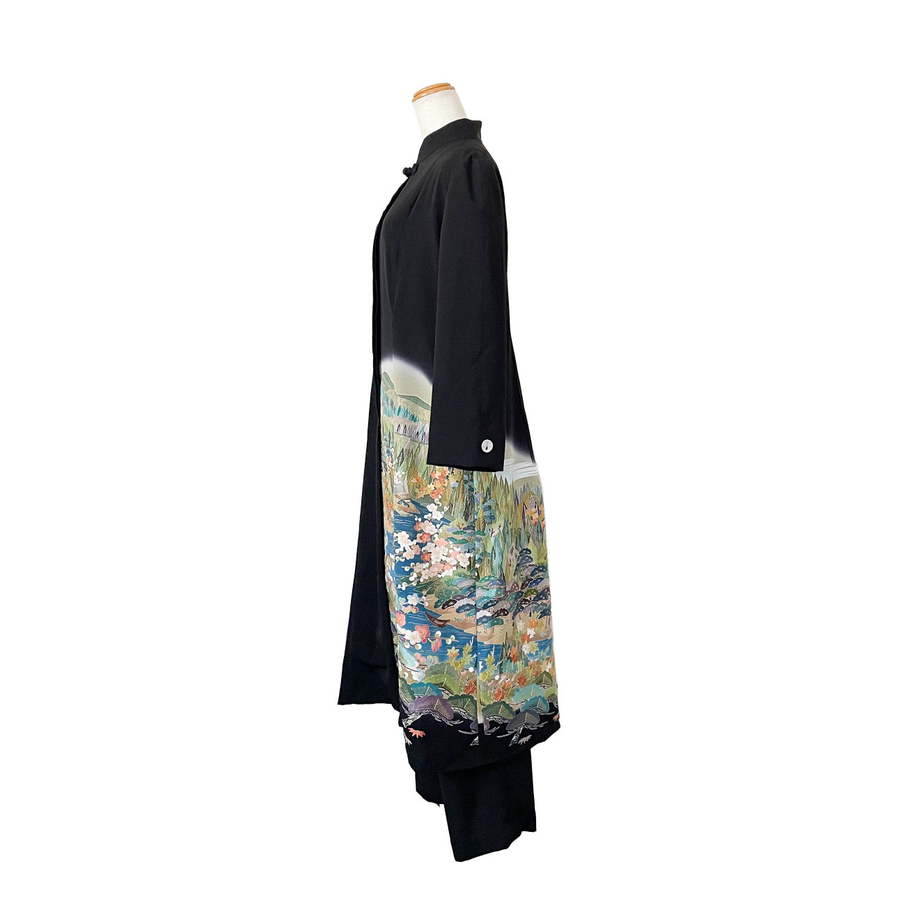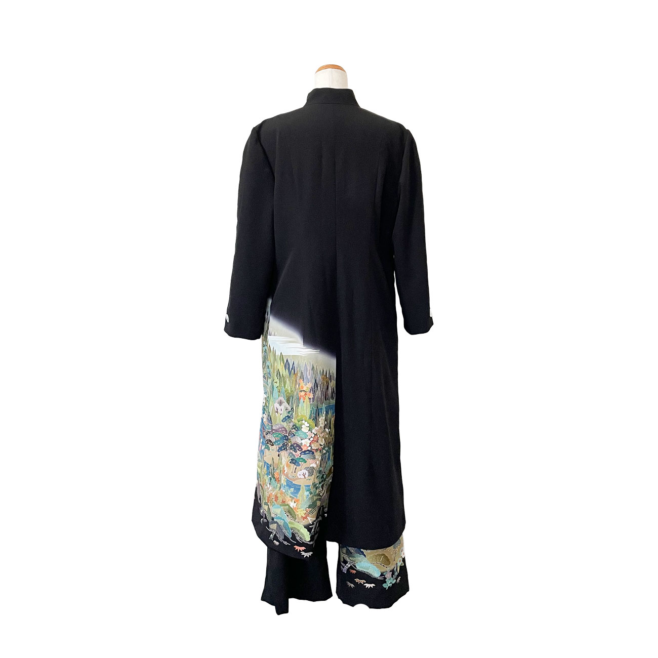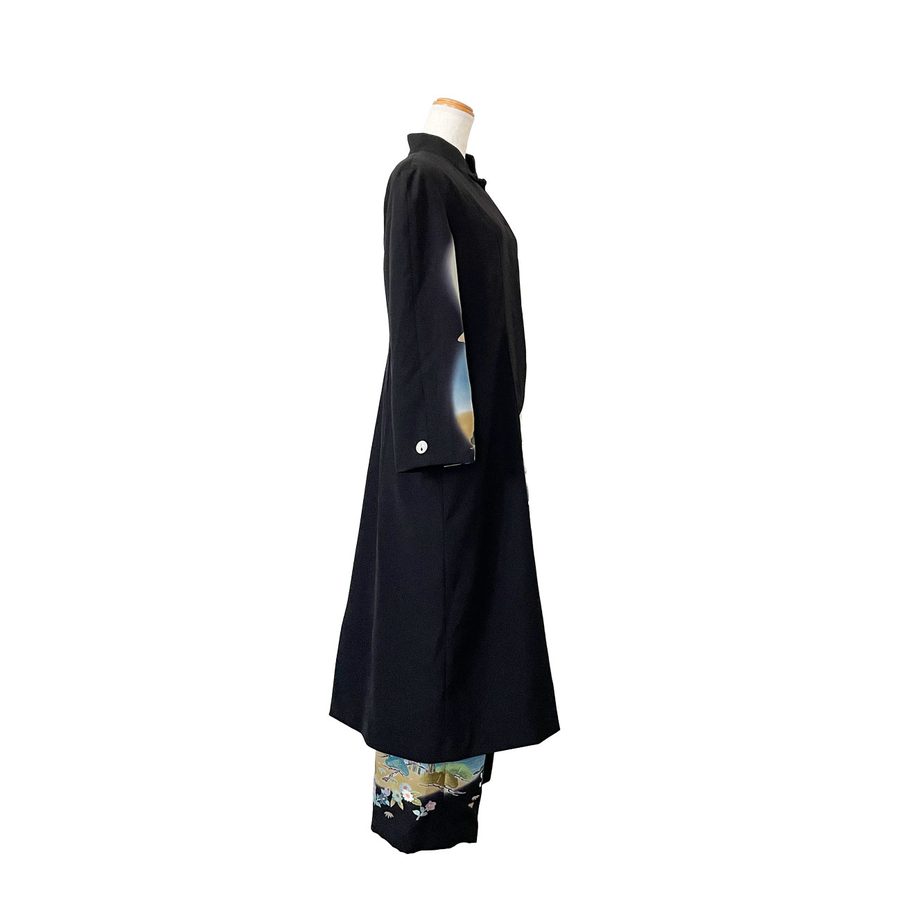 インパクトあるロングコートは模様配置もこだわって。袖口にはカフスボタンのように家紋も配置、上半身にも華やぎのあるドレスコートです。コートとコーディネートして着用した時に模様のバランスがとれるよう、ズボンにもこだわりました。