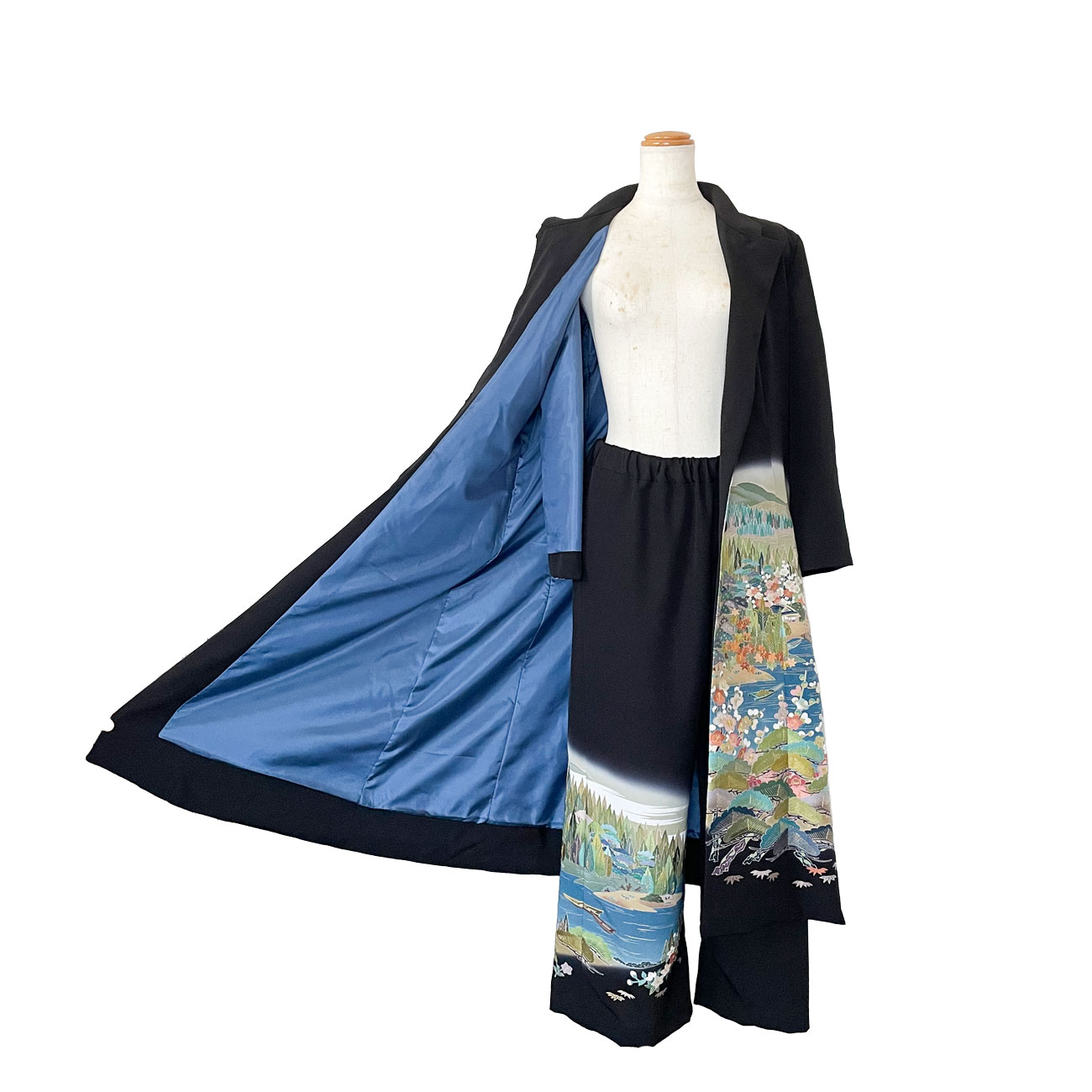着脱でちらりと見える裏地も、模様に合わせた落ち着いた青をお選びいただき、こだわりぬいた着物リメイクセットアップにお仕立てさせて頂きました。