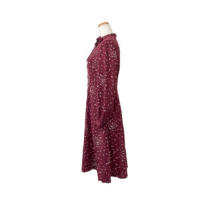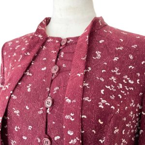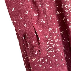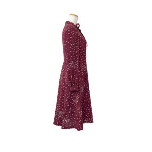 見る角度によって色味や艶めきの変化を感じる、とろみのあるアンティークの錦紗縮緬の着物をオーダーメイドでリメイク致しました。赤紫色に小さな小さな蝶の群れが舞う可愛らしい小紋。シルクの艶めきで大人の落ち着きも感じられます。フロントに沢山お付けしたループとボタン、袖口だけふんわりとボリュームアップした長袖のパフスリーブ、そして胸元のリボンタイが、フェミニンな雰囲気のドレスに仕上がりました。