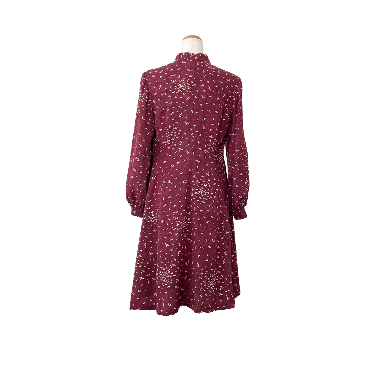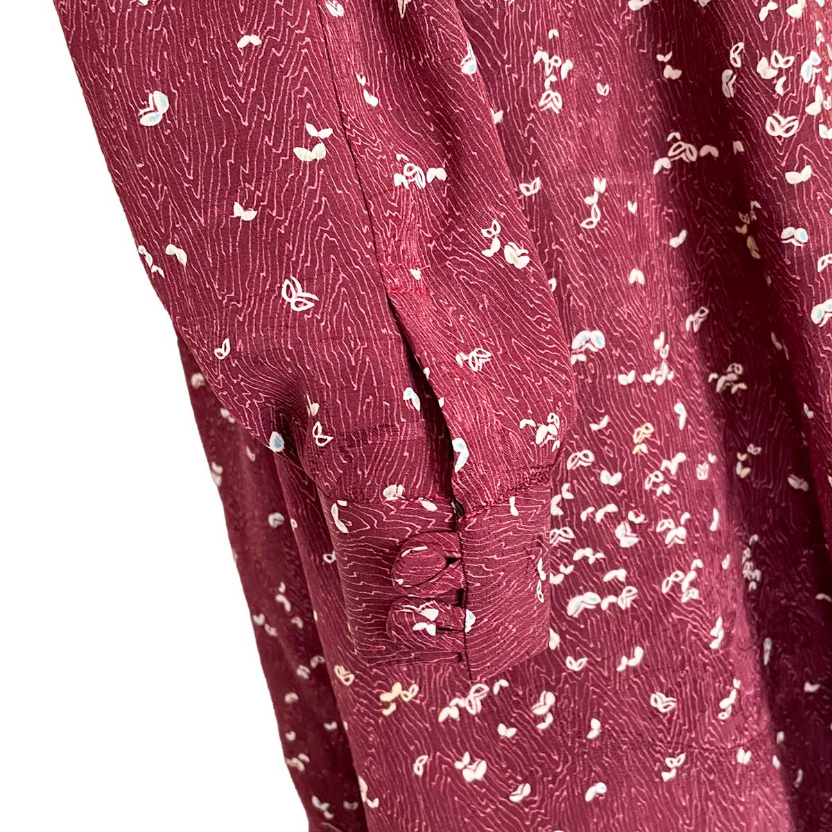 見る角度によって色味や艶めきの変化を感じる、とろみのあるアンティークの錦紗縮緬の着物をオーダーメイドでリメイク致しました。赤紫色に小さな小さな蝶の群れが舞う可愛らしい小紋。シルクの艶めきで大人の落ち着きも感じられます。フロントに沢山お付けしたループとボタン、袖口だけふんわりとボリュームアップした長袖のパフスリーブ、そして胸元のリボンタイが、フェミニンな雰囲気のドレスに仕上がりました。