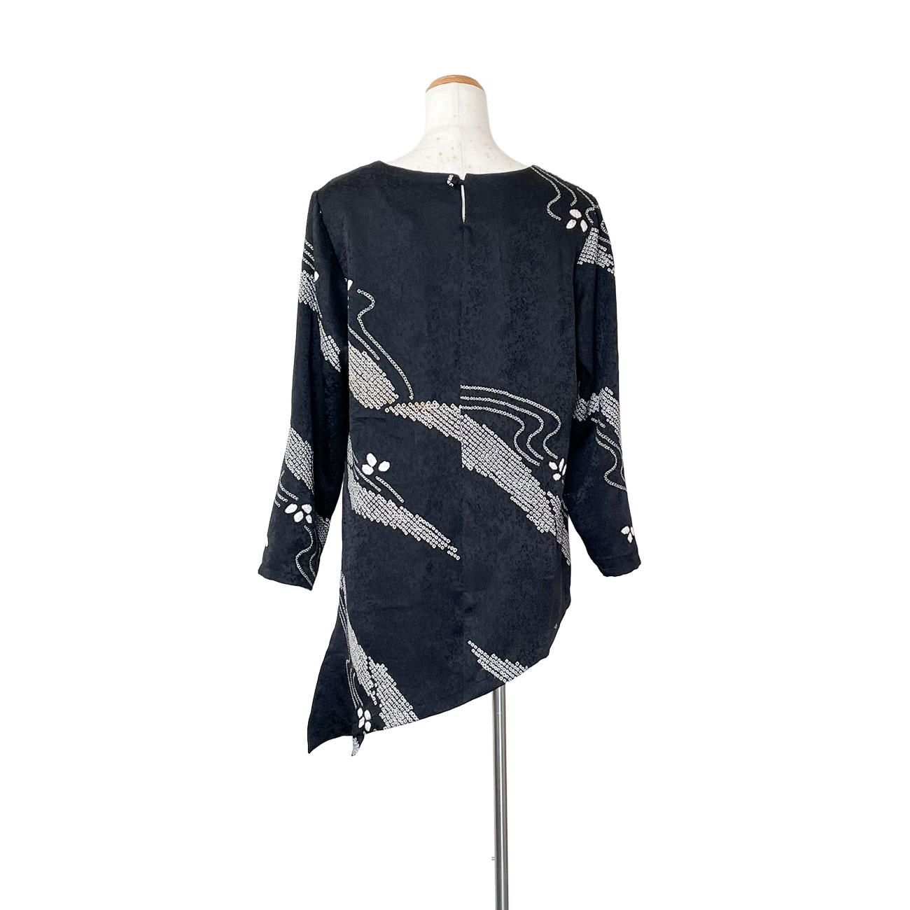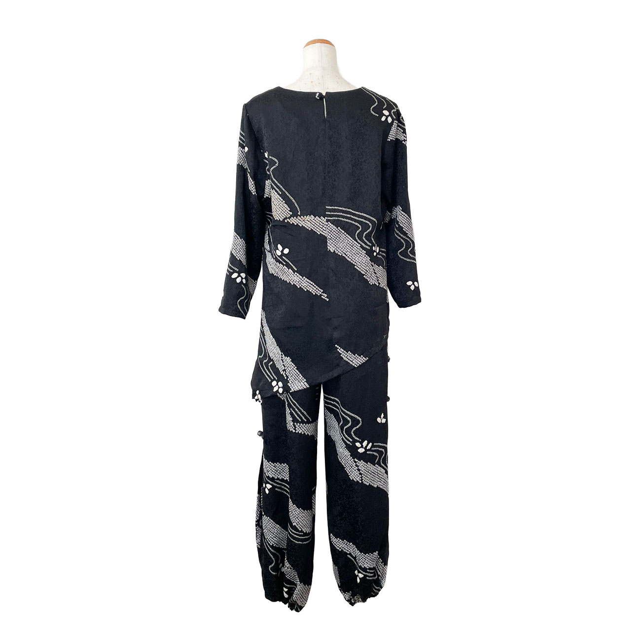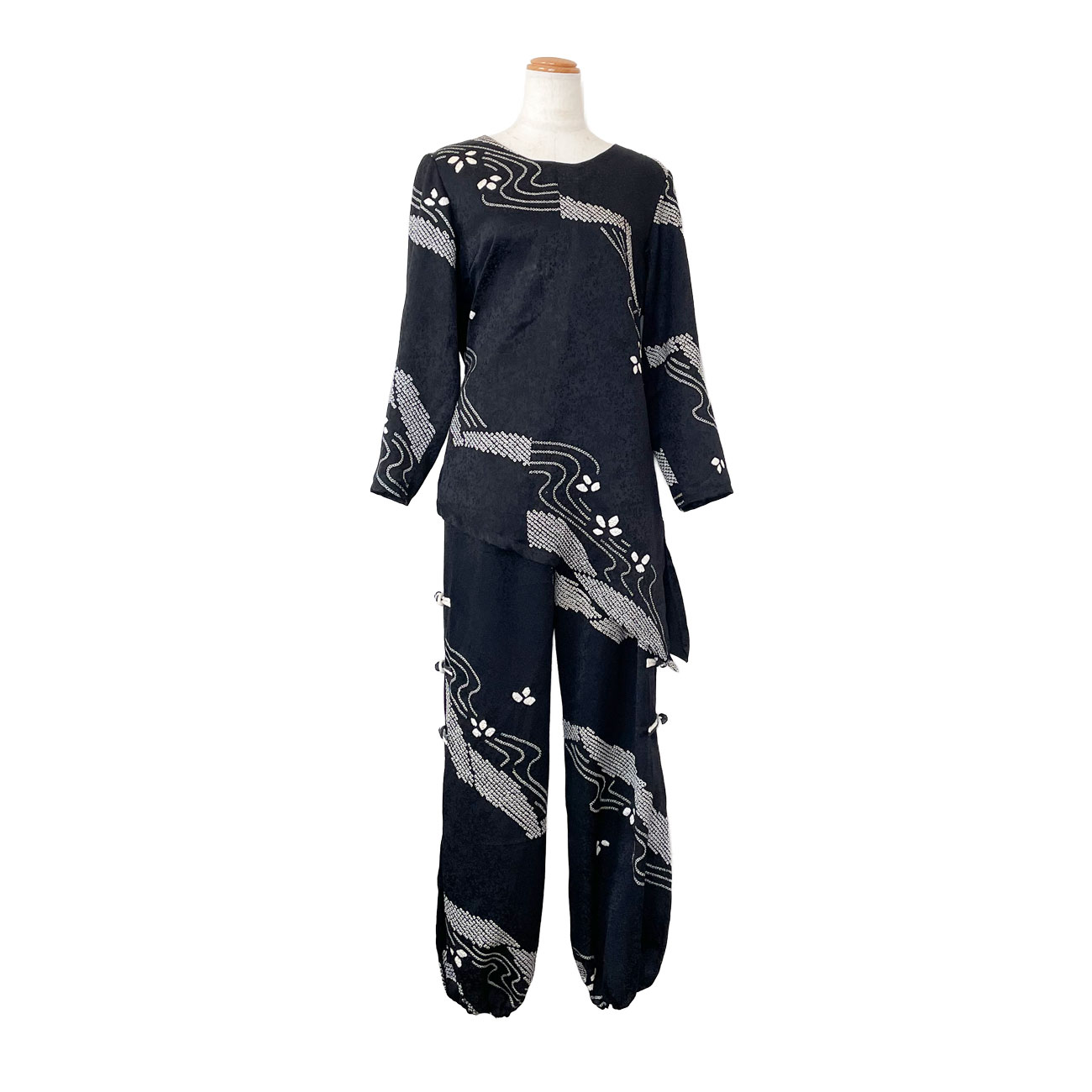 アシンメトリーチュニック&サイドオープンパンツ[流水柄絞り黒色小紋]