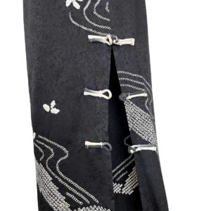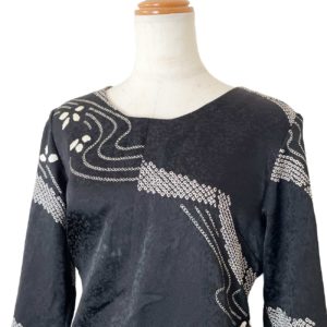 モノトーンの小紋をお預かりしてセットアップへリメイク。滑らかな流水に花びらが揺蕩うような模様の絞りが施された、艶やかな綸子生地です。落ち着いてスモーキーで、そして個性的。デザインもそんなテイストでお選びいただき、アシンメトリーなチュニック・サイドオープンにグラデーションのチャイナボタンをあしらった、どちらも絹春ならではのユニークさのあるお仕立てをさせていただきました。グラデーションのチャイナボタンも付属していた八掛からのお作りです。