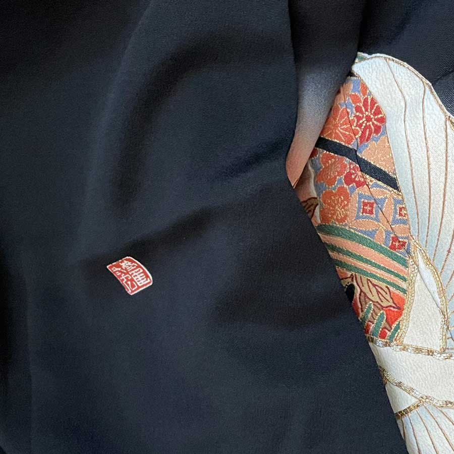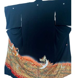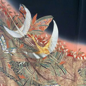 赤, 茶金, 飛鶴, 若松, 緑, 金彩, 金駒刺繍, 落款有