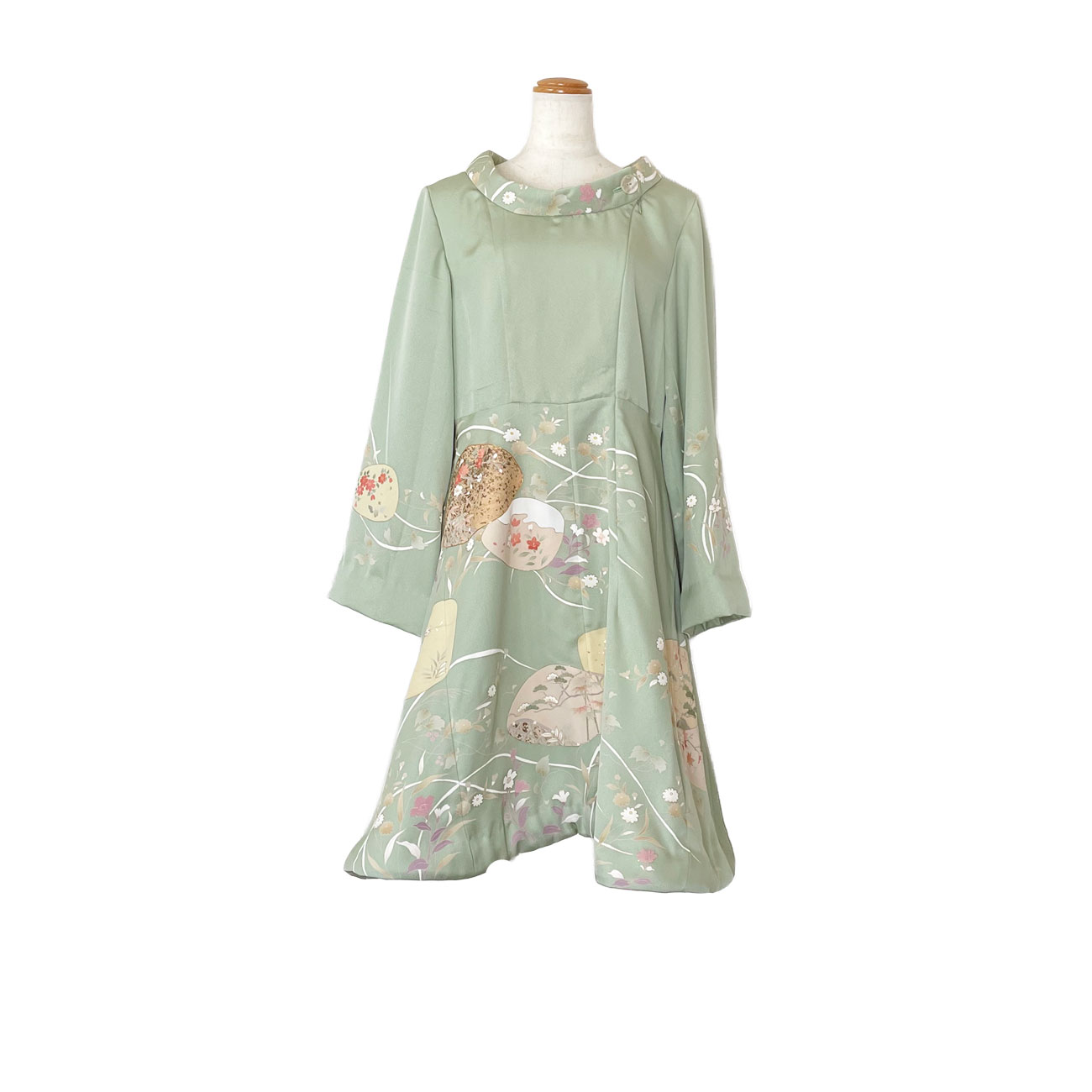 フレア袖ベルシルエットドレス[金彩蛤模様若草色訪問着]